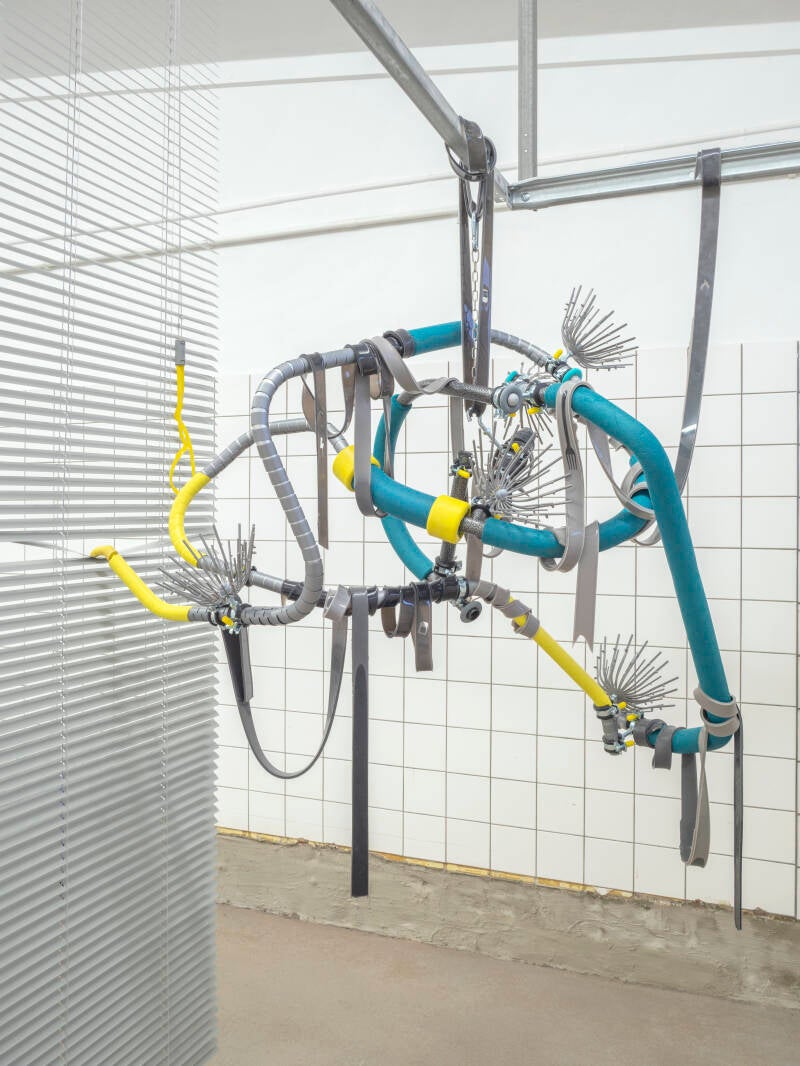 benjamin schoones places self-produced, sometimes modified or ready-made objects in constellations that nest within their given architecture. Chosen off-the-shelf parts are often linked to distribution and manufacturing processes that may have eventually been rendered obsolete. These works are sometimes supported by sounds & written gestures. Instead of following a fixated argument, it tends more toward exploring the incomprehensible feelings of disorientation in ever-changing tensions and (infra)structures. Rhythm, repetition & juxtaposition that leaves room for doubt, inertia, and physical engagement. Zooming in and out, circling from outside interactions of cold distances to inner somatic processing in interaction with all these surrounding synthetics. In this sense, the objects made are not simply as it is, but become an alienated mediator.